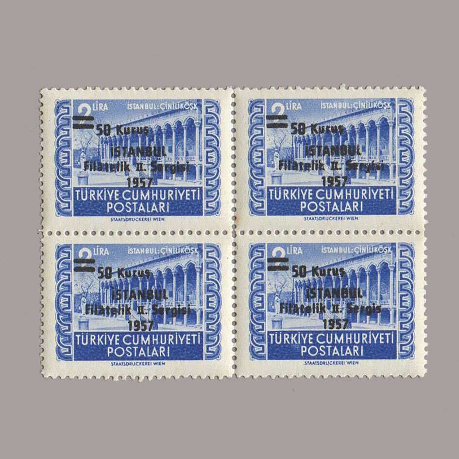 1957 İSTANBUL FİLATELİK II.SERGİSİ ŞÜRŞARJLI HATIRA PULU DÖRTLÜ BLOK